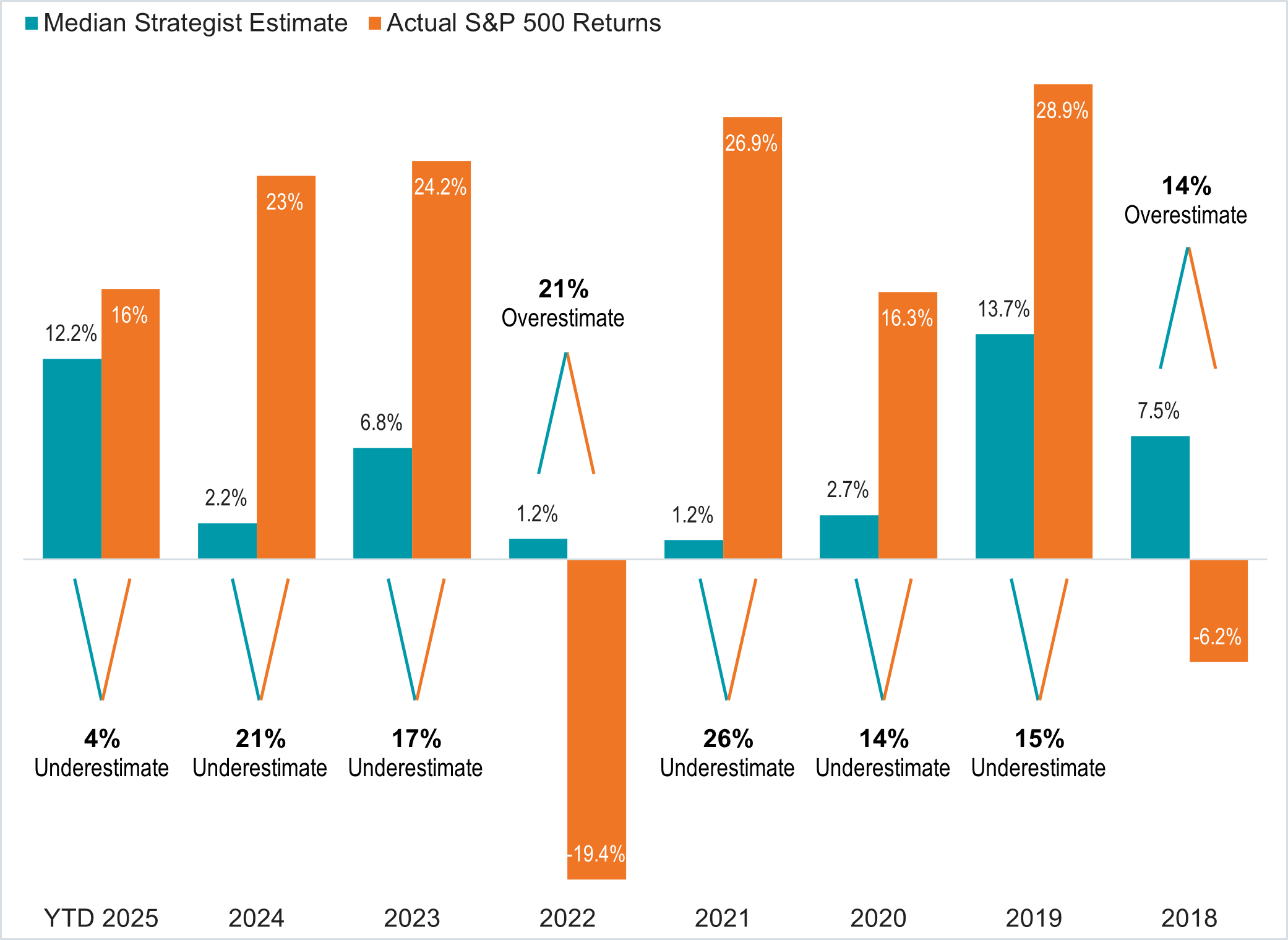Data from 1/1/2018 - 11/30/2025. Sources: Emily McCormick, “What Wall Street Strategists Forecast for the S&P 500 in 2019,” Yahoo Finance, December 31, 2018; Jeff Sommer, “Clueless About 2020, Wall Street Forecasters Are at It Again for 2021,” New York Times, December 18, 2020; Jeff Sommer, “Forget Stock Predictions for Next Year. Focus on the Next Decade,” New York Times, December 16, 2022; Senad Karaahmetovic, “Top Wall Street Strategists Give Their S&P 500 Forecasts for 2023,” Investing.com, December 27, 2022; Tom Aspray, “Should You Worry That Strategists Keep Raising Their S&P 500 Targets?” Forbes, October 20, 2024. Past performance is no guarantee of future results.