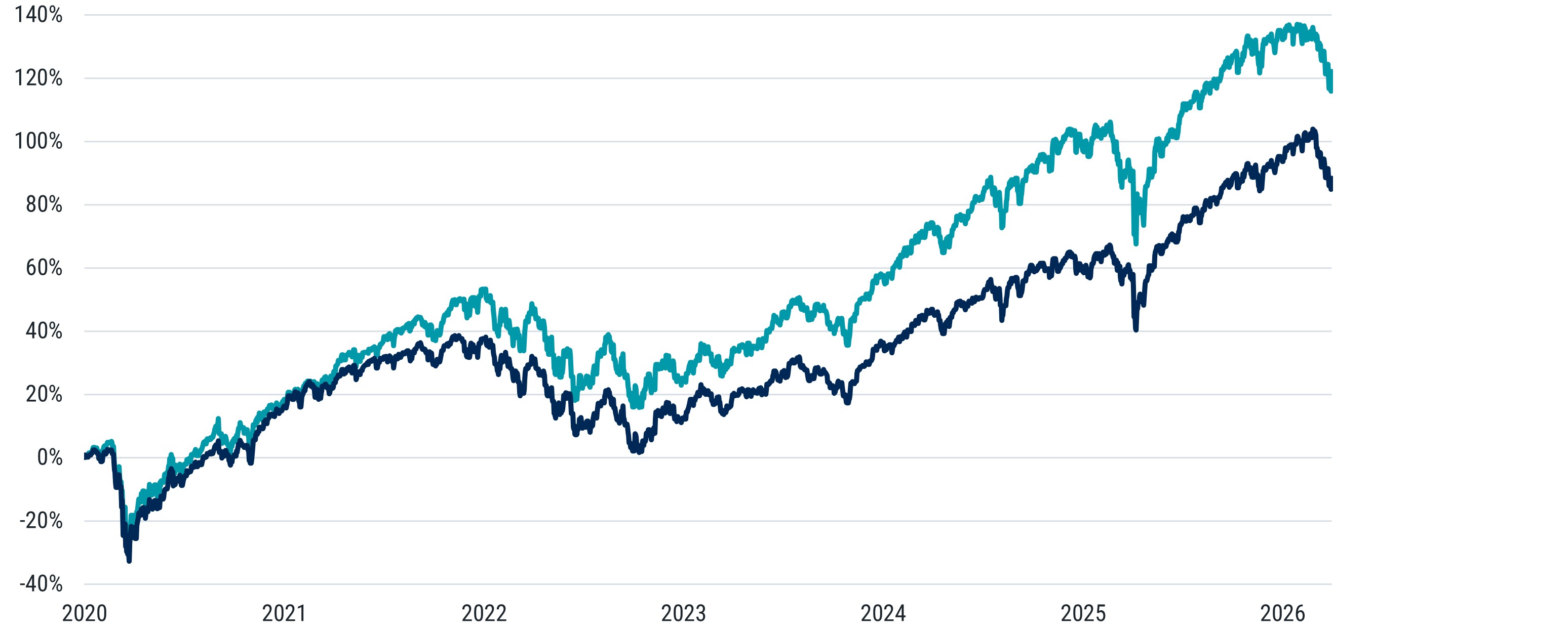 Source: Morningstar. Data from 1/1/2020 – 3/31/2026. Past performance is no guarantee of future results.
