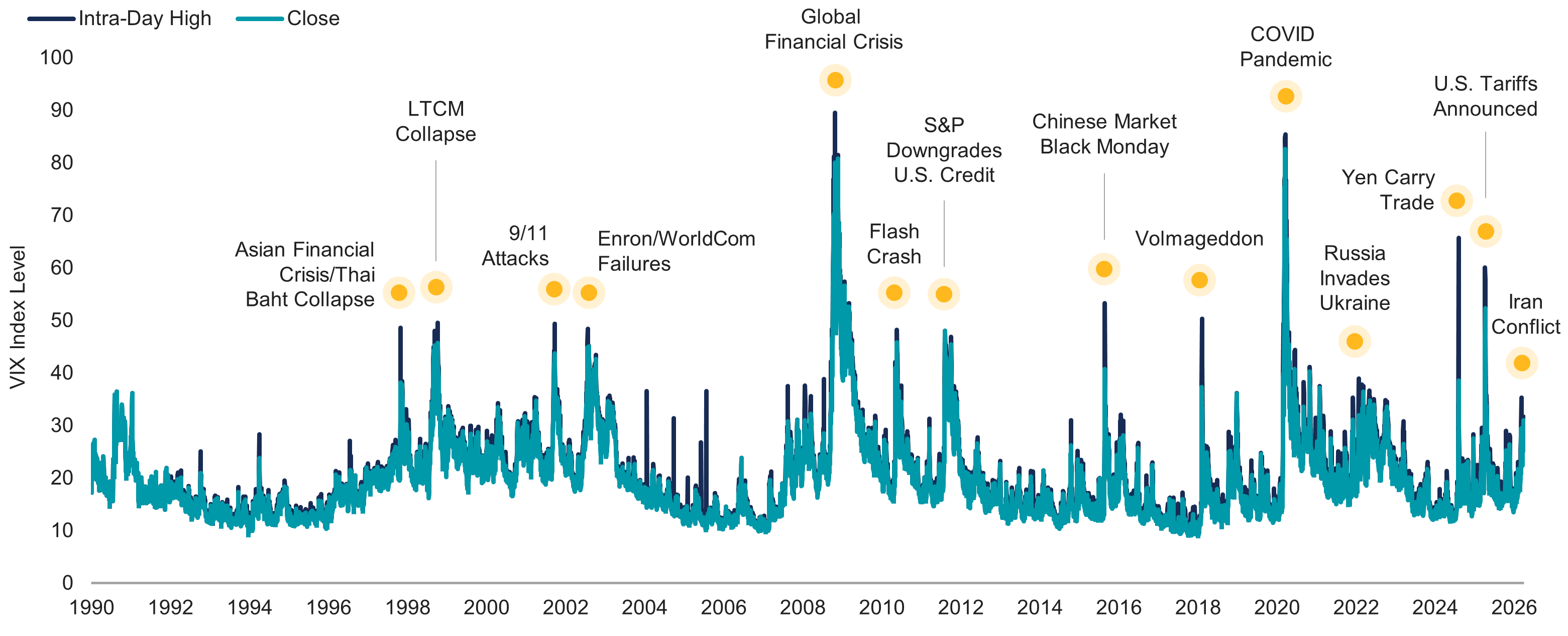 Source: CBOE. Data from 1/1/1990 – 3/31/2026. The VIX Index tracks the expected 30-day future volatility of the S&P 500 Index.