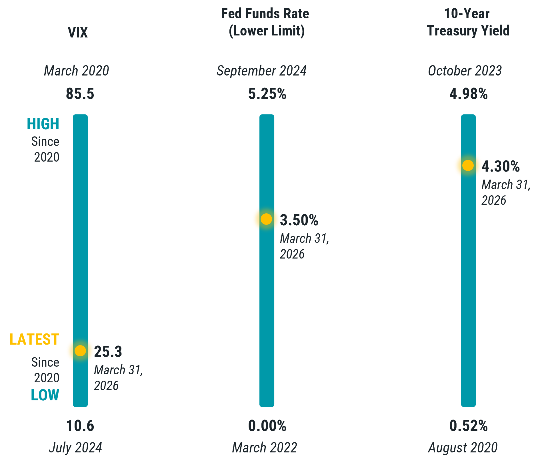 Source: Data from 1/1/2020– 3/31/2026. VIX Source: Cboe. Fed Funds Rate and 10-Year Treasury Yield Source: Federal Reserve Bank of St. Louis (FRED)